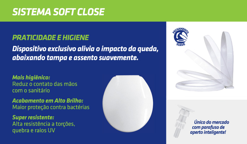 O Sistema Soft Close contém um dispositivo exclusivo que alivia o impacto da queda, baixando a tampa e o assento suavemente. Garante mais higiene e praticidade. Acabamento em alto brilho. Compatível com louça sanitária Celite - Linhas Life e Fit; Deca - Linhas Vogue Plus, Quadra e Aspen; Icasa - Linhas Etna e Sabatini; Ideal Standard - Linha Paris; Roca - Linha Nexo; Fiori - Linha Flox; Santa Clara - Linha Dona Beija.Precisa de ajuda?